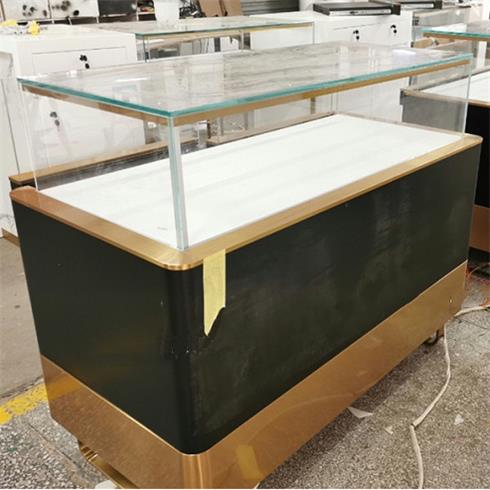 片尺寸价格说明定做服务。该款展柜为不锈钢框架结构和木结构相组合,金色部分为拉丝不锈钢经刨槽折弯、无缝焊接和电镀无指纹处理等多道工序精制而成,黑色部分为麻面黑色哑光烤漆饰面。
