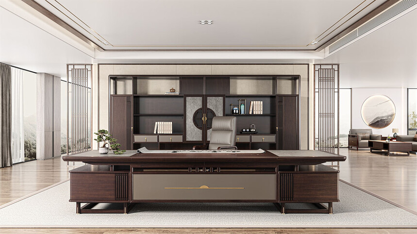 鸿泰系列是一款新中式风格的办公家具,设计灵感源于中式传统装饰纹样“回”字形,因其形式回环反复,延绵不断,在民间有“富贵不断头”的说法,有连绵不断、吉利长久的吉祥寓意,在造型上主要采用硬朗简洁的直线条,温润的乌金木与质朴的岩板相结合,刚柔并济,时尚大方,既使得中式家具古典、质朴的内涵显现,又符合现代办公追求的时尚感、实用性。